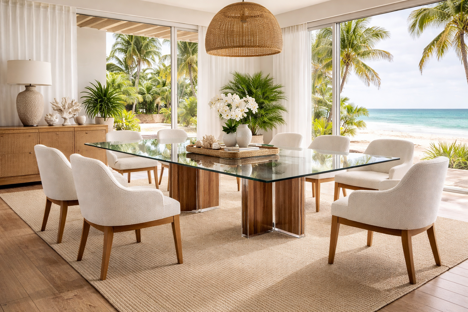 The Betty Dining Table is a bold architectural statement that combines modern transparency with natural texture. Its double pedestal base creates a strong visual foundation while maintaining balance and openness through the use of acrylic and glass.