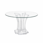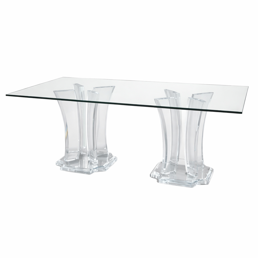 The beveled glass top adds refinement and lightness, allowing the structure below to remain visually prominent without overwhelming the room. Designed to blend strength with elegance, this table works beautifully in contemporary dining environments.