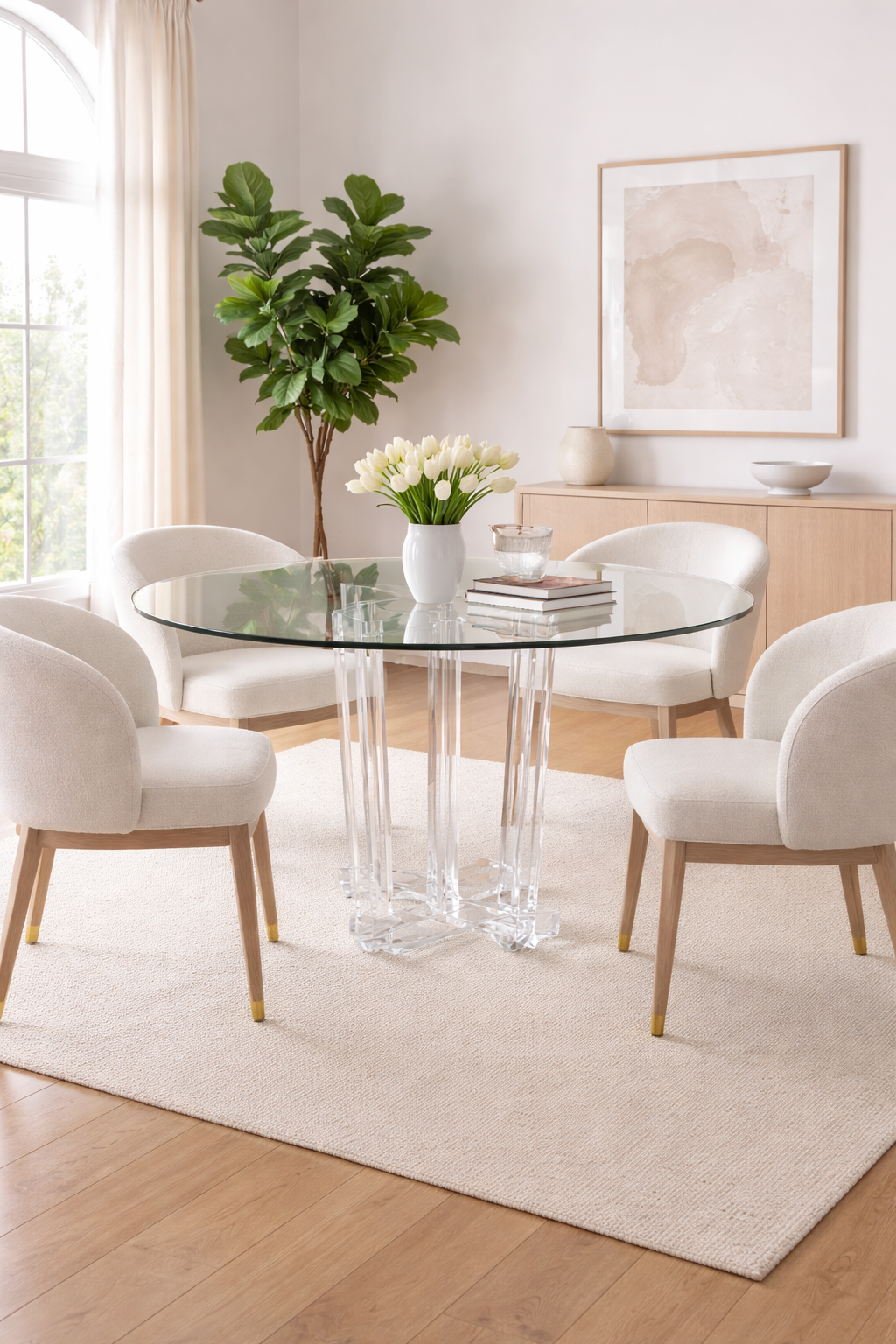 The Victoria Acrylic Dining Table is a refined expression of modern geometry and craftsmanship. Defined by clean lines, sharp angles, and sculptural cutouts, this table creates a striking architectural presence while maintaining a light and elegant visual profile.